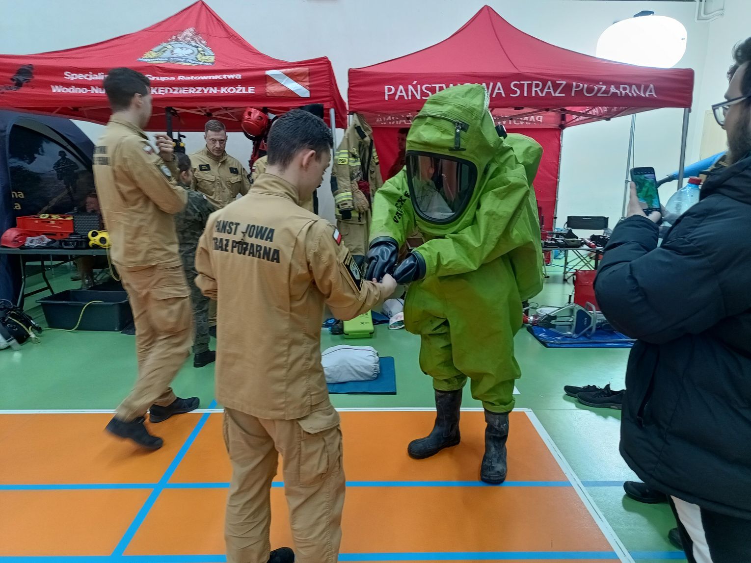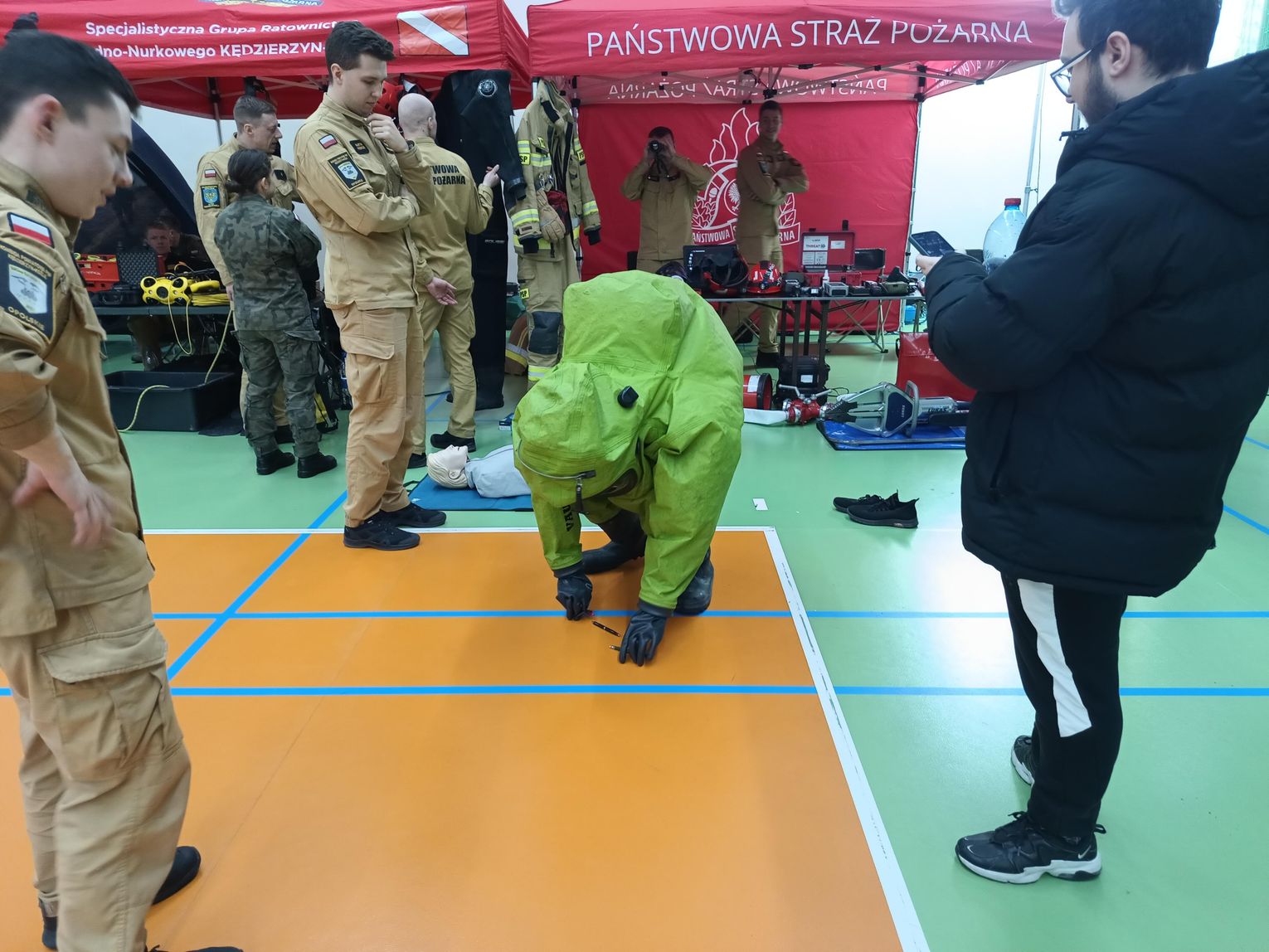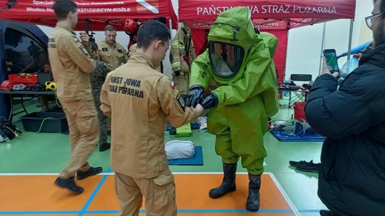 Dzisiaj znajdujemy się na Hali Sportowej Śródmieście w Kędzierzynie-Koźlu, gdzie po raz kolejny organizowana jest edycja mundurowych targów pracy pod nazwą spotkanie z mundurem. Po raz kolejny nie zabrakło stanowisk Państwowej Straży Pożarnej specjalistycznej grupy ratownictwa chemiczno-ekologicznego czy też specjalistycznej grupy ratownictwa wodno-nurkowego. Prowadzimy również instruktaż pierwszej pomocy, a także jest tu po raz pierwszy stoisko związane z profilaktyką szeroko rozumianych zagrożeń, których źródłem jest tlenek węgla. Dlatego też prowadzimy instruktaż montażu czujników tlenku węgla i czujników dymu. Na naszych stoiskach przekazujemy również informacje jak można się dostać do służby w straży pożarnej czy to z naboru z ulicy czy przez szkoły pożarnicze w Polsce. - powiedział starszy kapitan Piotr Krok, rzecznik prasowy Komendy Powiatowej Państwowej Straży Pożarnej w Kędzierzynie-Koźlu.