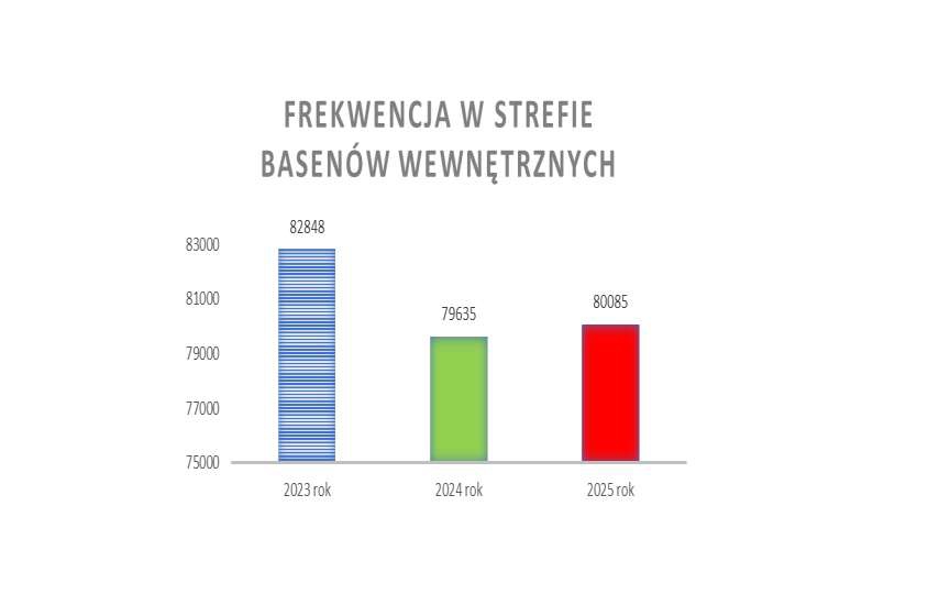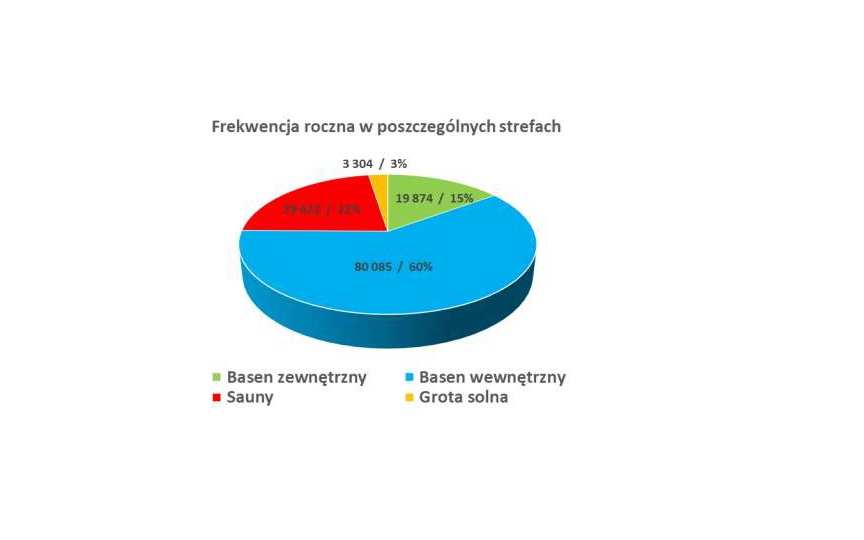 Frekwencja w podziale na strefy kształtowała się w 2025 roku następująco: ze strefy basenów zewnętrznych skorzystało łącznie 19 874 osób, ze strefy basenów wewnętrznych 80 085 osób, ze strefy saun 29 622 osób, natomiast z groty solnej 3 304.