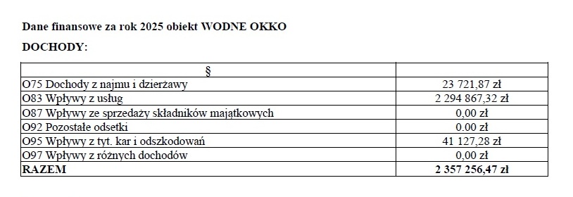 Dane finansowe za rok 2025 pokazują, że Wodne oKKo wygenerowało kwotę dochodów sięgającą 2 357 256,47 zł.  Natomiast wydatki pochłonęły w sumie 5 886 565,65 zł z czego najwyższe kwoty to: 2 354 528,66 zł (wynagrodzenia pracownicze, 13, składki ZUS, FP, wynagrodzenia bezosobowe), 1 783 524,58 zł (energia, ciepło, woda) oraz 1 164 724,50 zł (ścieki, dystrybucja energii, konserwacja urządzeń, ratownicy).