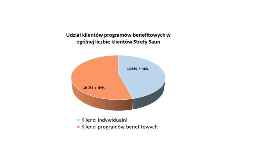 Dla porównania w roku 2024 klienci „benefitowi” stanowili 22 % ogólnej liczby odwiedzających obiekt. Największy odsetek klientów programów benefitowych w stosunku do ogólnej liczby klientów, stanowią saunowicze. W 2025 roku 54% odwiedzających Strefę Saun było klientami programów benefitowych. Ich udział w ogólnej liczbie odwiedzających utrzymuje się na porównywalnym poziomie, w 2024 roku było to 55%.