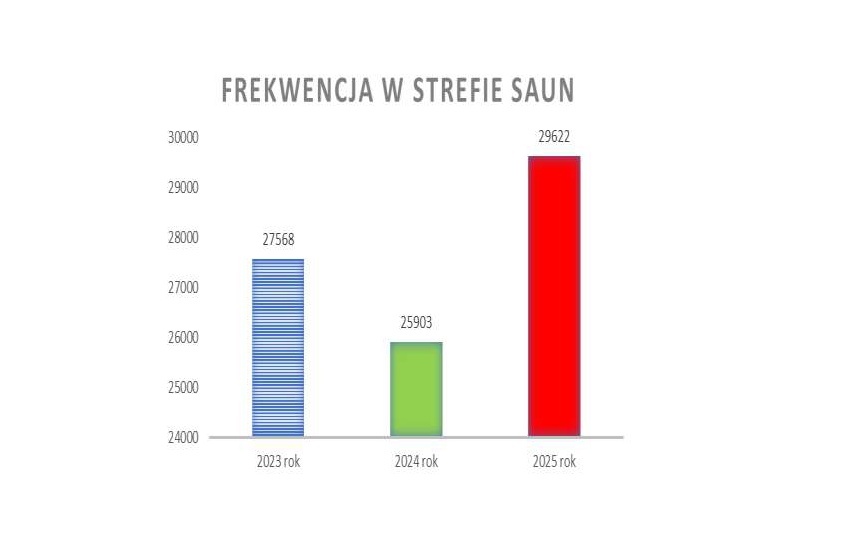 Przypomnijmy, w Wodnym oKKu funkcjonuje też beztekstylna strefa saun, w związku z czym w godzinach ogólnodostępnych mogą z niej korzystać tylko osoby pełnoletnie. W 2025 roku strefa saun funkcjonowała bez zakłóceń przez cały rok. W tym czasie ze strefy saunowej skorzystało 29 622 osób, co w porównaniu z rokiem 2024 (25 903 osób) dało wzrost frekwencji o 14,4% (+3 719 osób), natomiast w zestawieniu z rokiem 2023 (27 568 osób), frekwencja wzrosła o 7,5% (+2 054 osób). W roku 2025 osiągnięto w strefie saun najwyższą frekwencję roczną od momentu oddania obiektu do użytku w 2019 roku.
