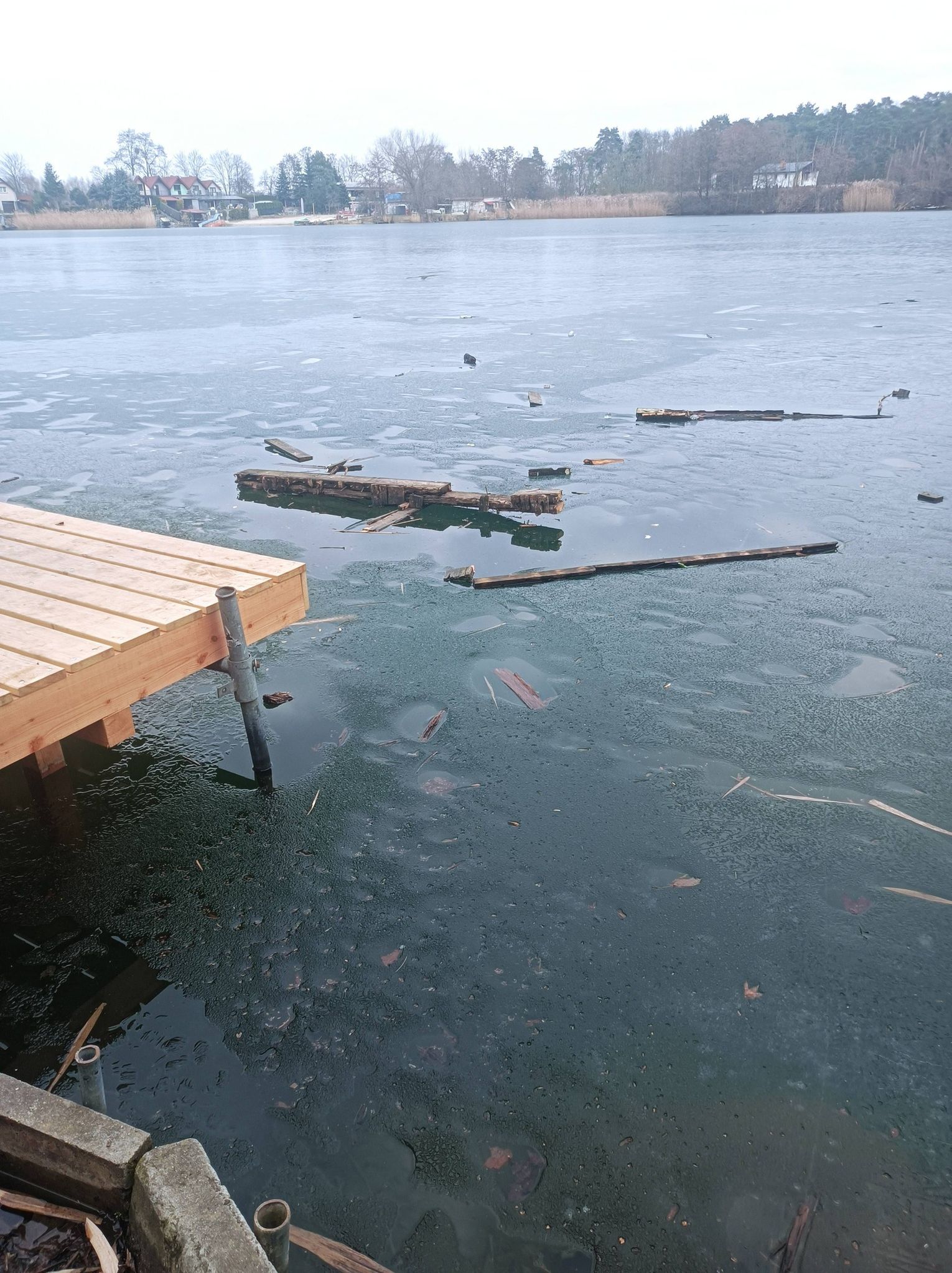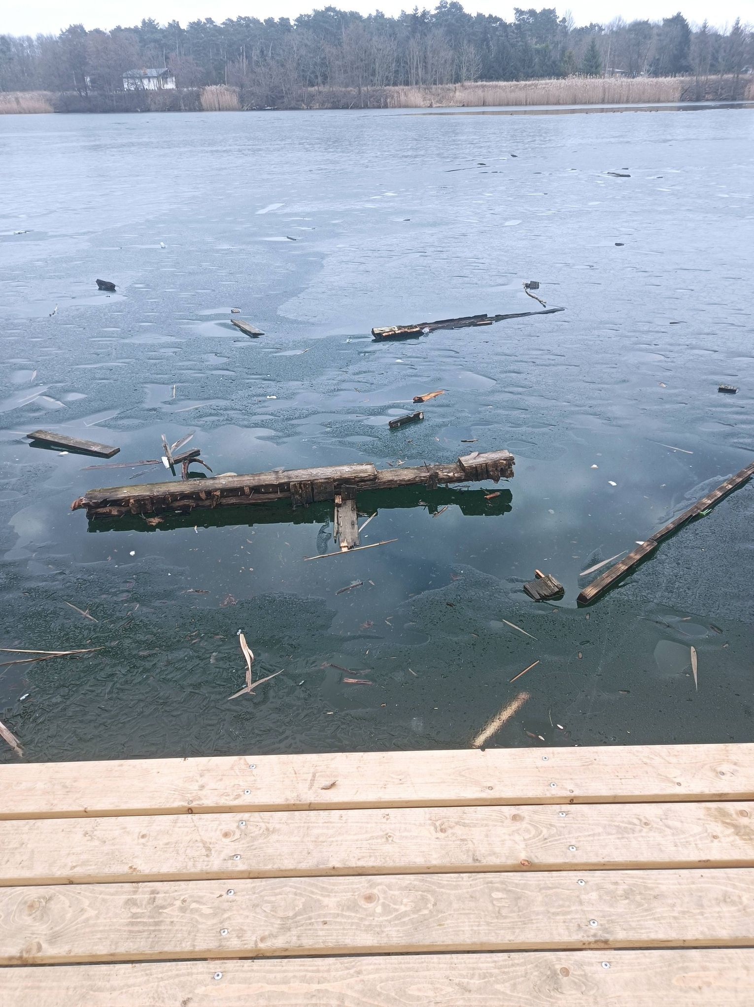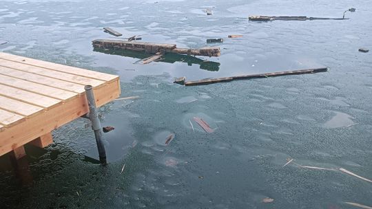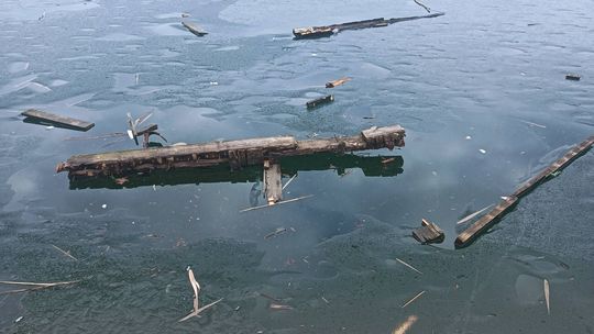 Zamiast trafić na stos przeznaczony do utylizacji, część starych desek ląduje w wodzie. To efekt nieodpowiedzialnego zachowania osób odwiedzających zbiornik. Pozostałości po rozbiórce stały się materiałem do zabawy, a nie odpadem, który powinien zostać usunięty.