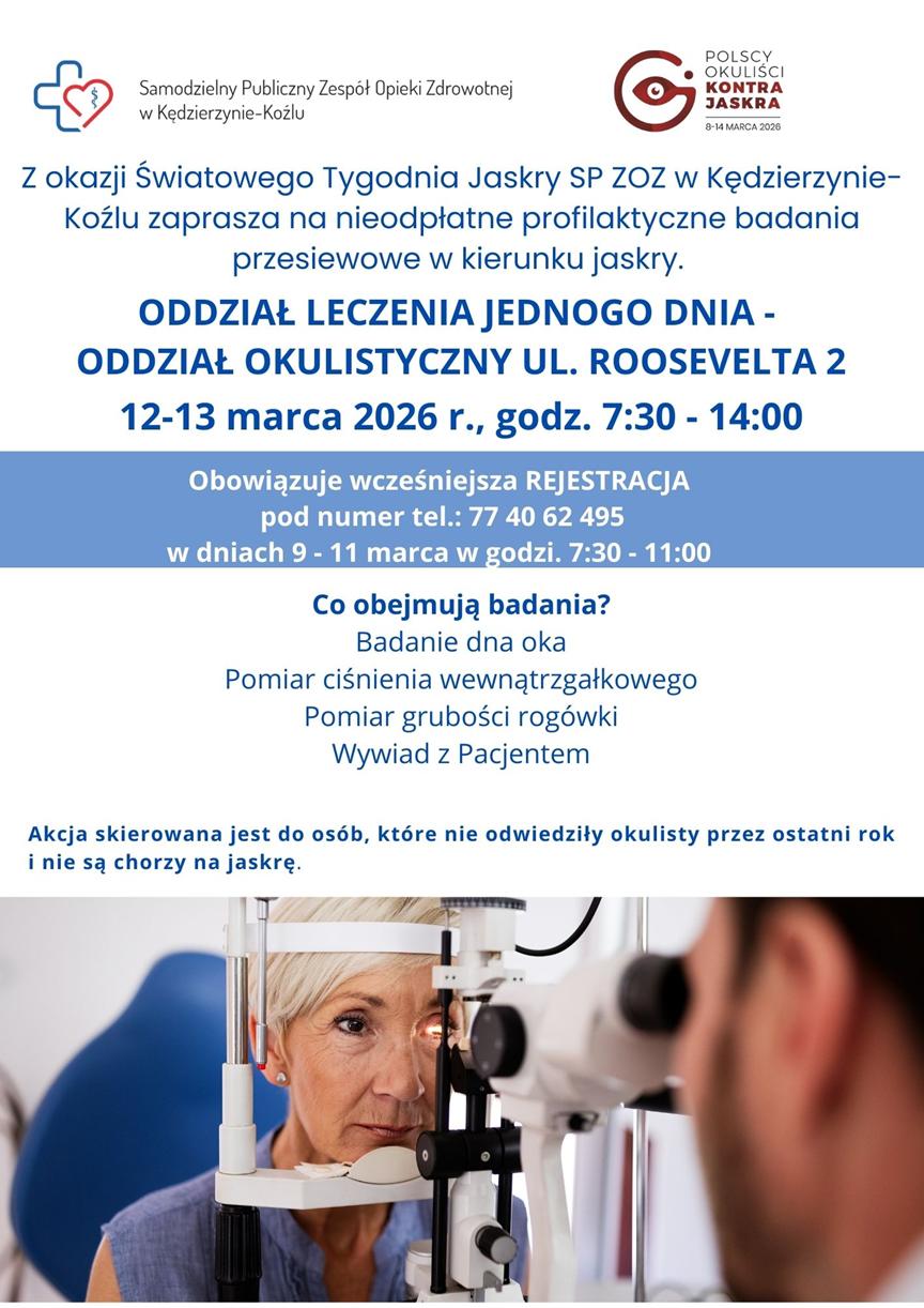 Samodzielny Publiczny Zespół Opieki Zdrowotnej w Kędzierzynie-Koźlu organizuje bezpłatne badania profilaktyczne w kierunku jaskry w ramach Światowego Tygodnia Jaskry. Badania odbędą się 12 i 13 marca w godzinach od 7.30 do 14.00 w oddziale okulistycznym przy ul. Roosevelta 2. Udział w badaniach wymaga wcześniejszej rejestracji pod numerem telefonu 77 40 62 495. Zapisy będą prowadzone do 11 marca, w godzinach od 7.30 do 11.00.