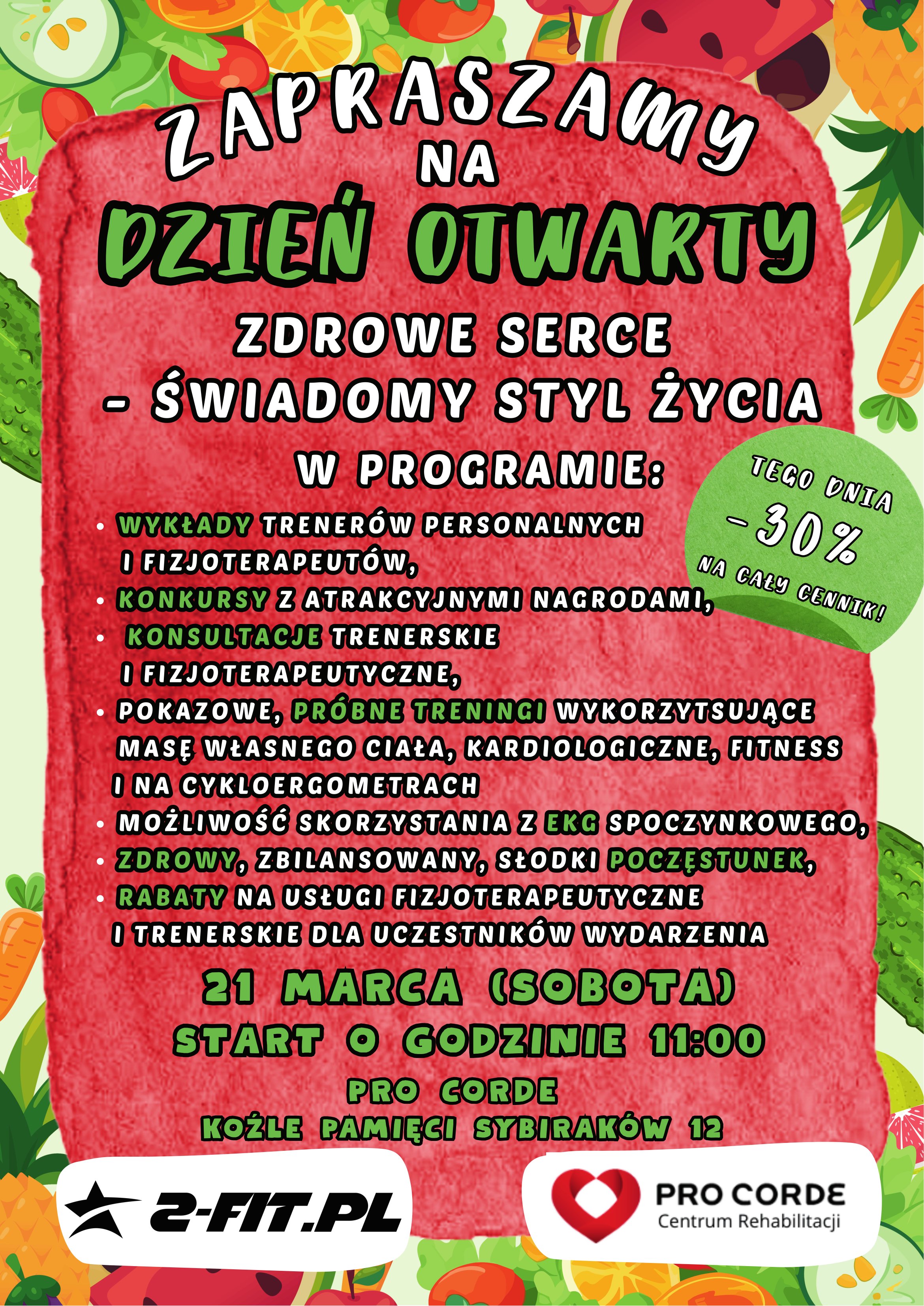 Dla uczestników Dnia Otwartego przewidziano atrakcyjne rabaty na zakup usług w dniu 21 marca 2026 roku, zarówno z cennika Pro Corde Centrum Rehabilitacji, jak i na treningi personalne.
