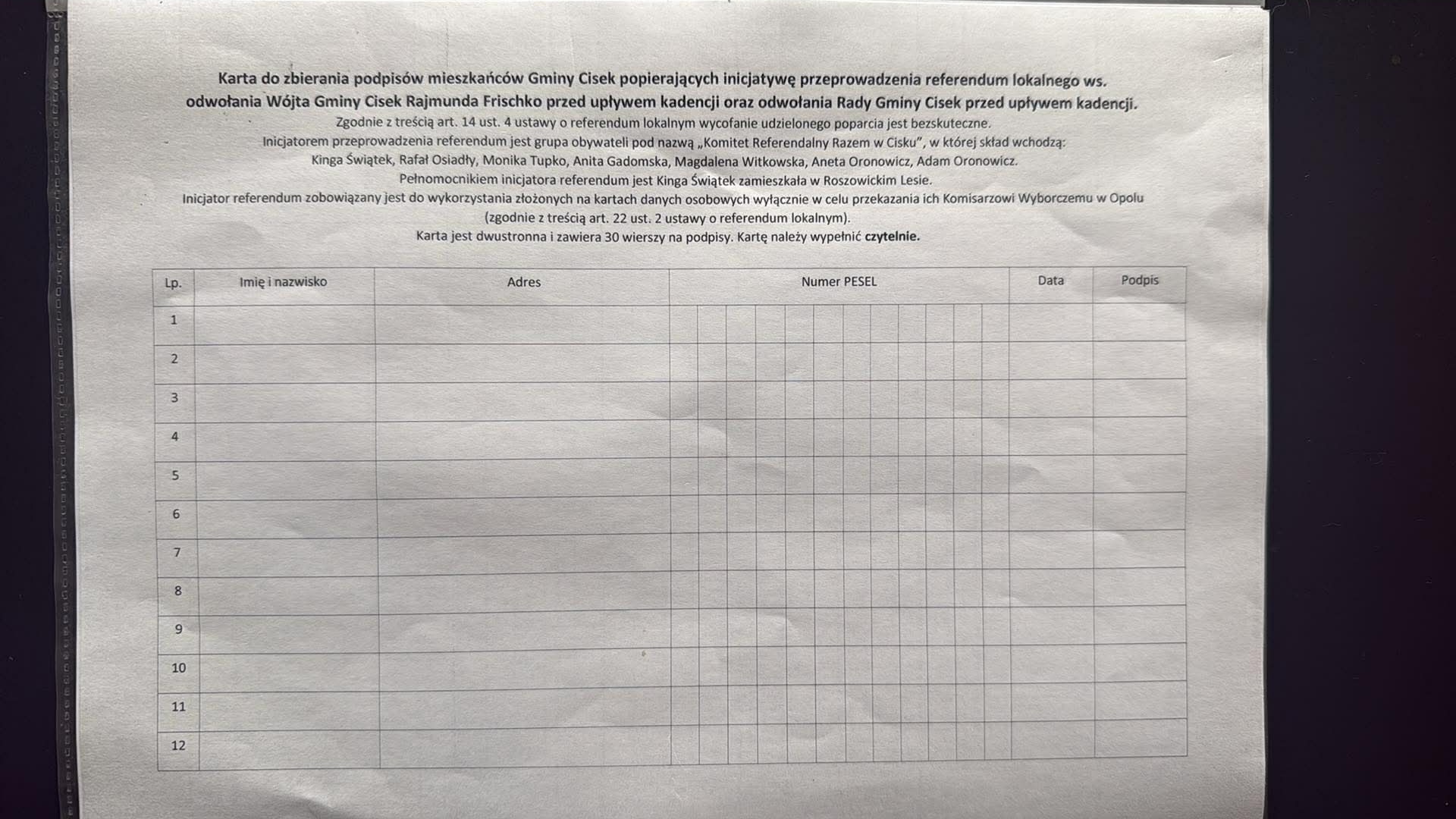 Równolegle komitet rozpoczął proces zbierania podpisów mieszkańców popierających inicjatywę. Wykorzystywane karty zawierają dane członków komitetu, dane pełnomocnika, opis celu referendum oraz pouczenia wynikające z ustawy. Mieszkańcy wpisują na nich swoje dane osobowe, datę oraz podpis. Na karcie przywołano art. 14 ust. 4 ustawy o referendum lokalnym, który stanowi, że wycofanie udzielonego poparcia jest bezskuteczne. Zgodnie z art. 22 ust. 2 ustawy dane osobowe mogą być wykorzystane wyłącznie w celu przekazania ich Komisarzowi Wyborczemu w Opolu.