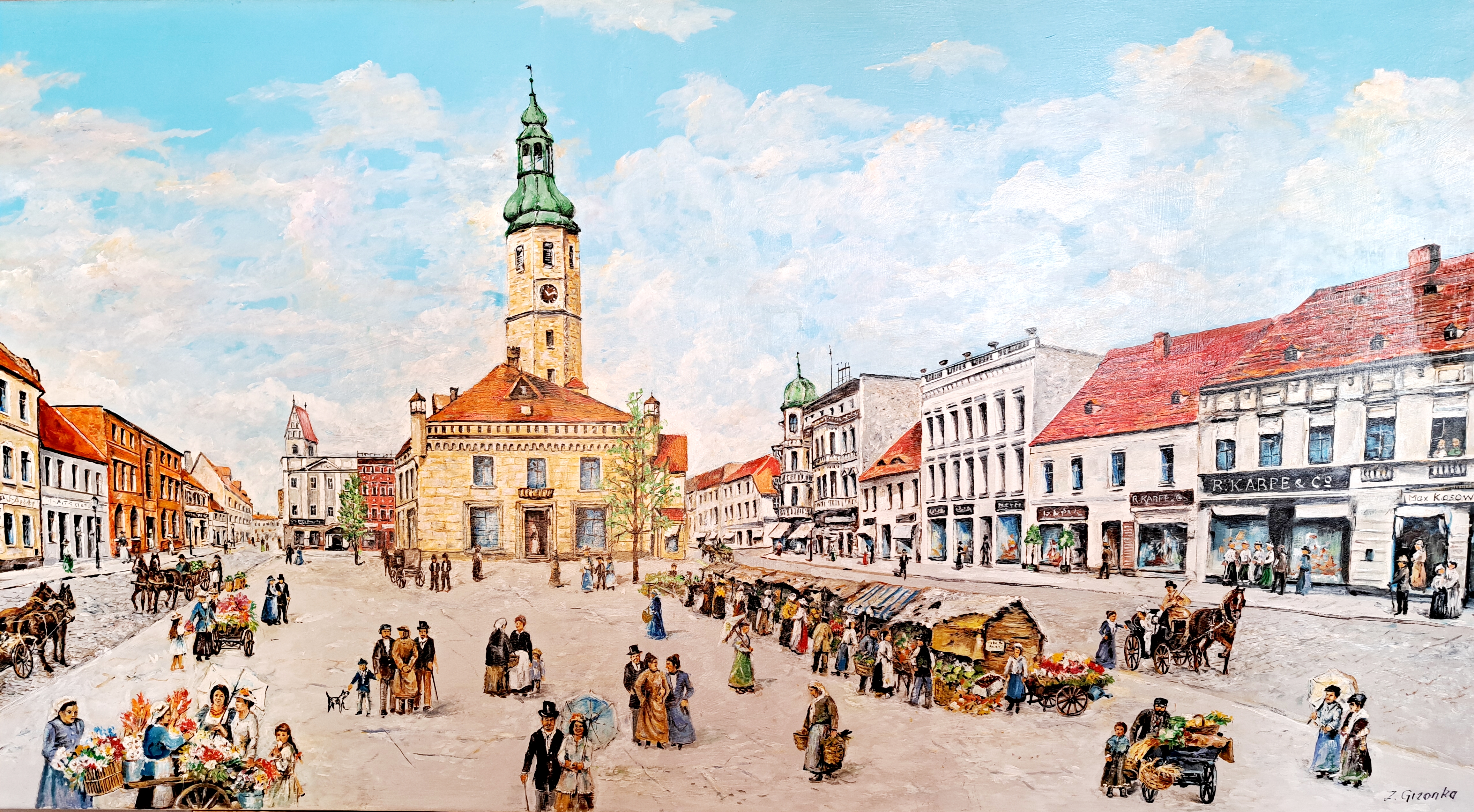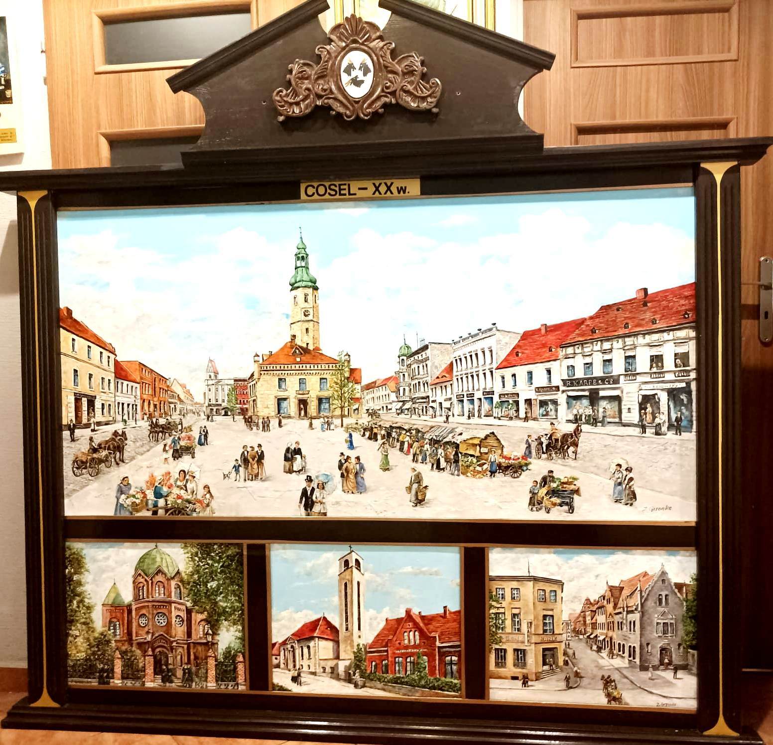 - Otrzymałem kiedyś kawał płótna w prezencie i chodził mi po głowie pomysł, aby namalować na nim stary kozielski rynek. Zajęło mi to sporo czasu, ale najważniejsze, że plan został zrealizowany, Dołożyłem do niego trzy inne, mniejsze obrazy, spięte ze sobą za pomocą stylowego drewnianego obramowania, zwieńczonego herbem naszego miasta z tamtej epoki - wyjaśnia pan Zbyszek.