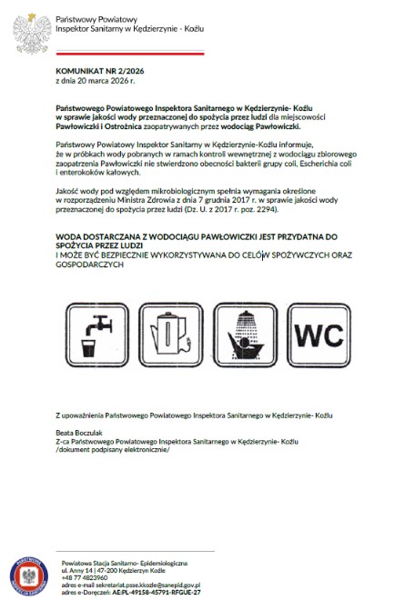 Państwowy Powiatowy Inspektor Sanitarny w Kędzierzynie-Koźlu poinformował, że najnowsze wyniki badań nie wykazały obecności bakterii coli, Escherichia coli ani enterokoków kałowych.