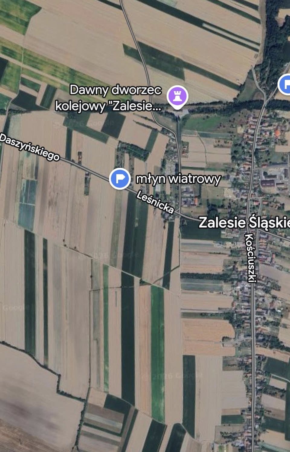 Wiatrakiem w Zalesiu Śląskim, czyli młynem napędzanym wiatrem zainteresował mnie pan Błażej Duk. Przyznam że mocno się zdziwiłem, bo interesując się Zalesiem i jego okolicami zwyczajnie przeoczyłem symbol wiatraka na mapach. Postanowiłem udać się na peryferia Zalesia, a konkretnie na ulicę Leśnicką żeby odszukać miejsce gdzie stał młyn i dowiedzieć się czy coś po nim pozostało. Trafiłem tam szybko, bo zatrzymując się przy jednym z domów usłyszałem dokładne wskazówki jak trafić w miejsce gdzie stał wiatrak. Okazało się że jest to jeden z ostatnich budynków przy wylocie na Lichynię. Jak usłyszałem od przesympatycznych właścicieli posesji po młynie nic nie zostało. Wiatrak, który się tam znajdował był prawdopodobnie tak zwanym koźlakiem, czyli obiektem który można było przesuwać, aby wykorzystać wiatr wiejący z każdego kierunku. Smutne jest to że po wielu zabytkowych obiektach znajdujących się na Śląsku nie pozostał nawet ślad - napisał Sławomir Wilkowski z kanału Bunker King.
