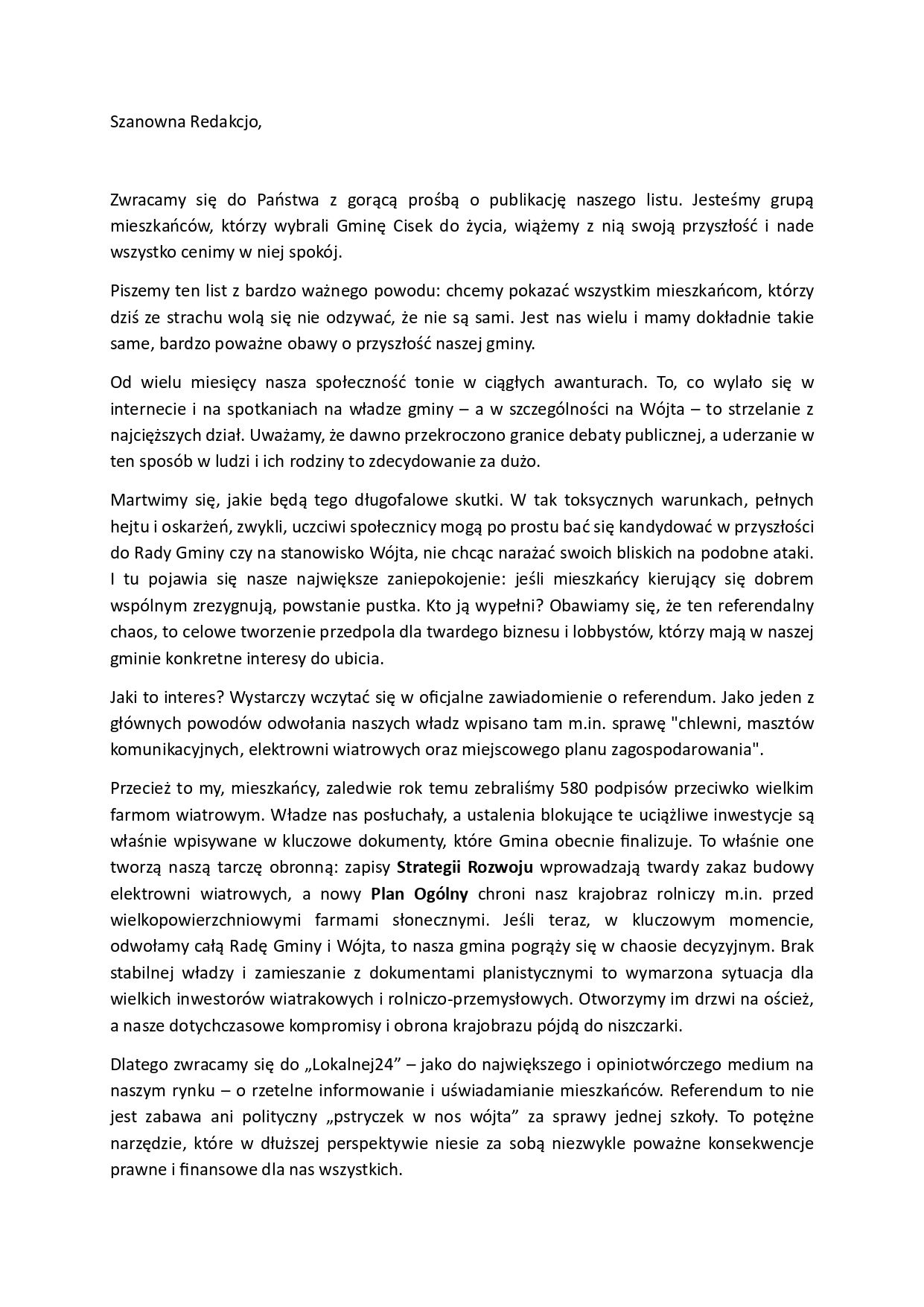 Autorzy wyjaśniają, że piszą „z bardzo ważnego powodu”, ponieważ chcą zwrócić uwagę na to, że wiele osób milczy ze strachu. Twierdzą, że jest ich wielu i że mają „dokładnie takie same, bardzo poważne obawy o przyszłość (...) gminy”.