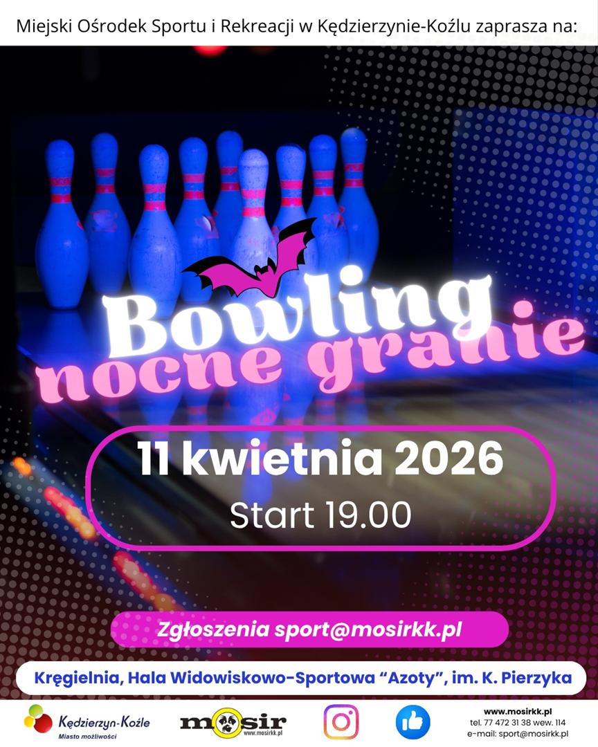 To propozycja dla wszystkich, którzy chcą spędzić wieczór aktywnie, spotkać się ze znajomymi i poczuć sportowe emocje na torze. W zawodach, które odbędą się na kręgielni w hali im. Kazimierza Pietrzyka przy ul. Mostowej, mogą wziąć udział zarówno osoby regularnie grające w bowling, jak i ci, którzy dopiero chcą spróbować swoich sił w tej dyscyplinie. Zgłoszenia przyjmowane są do 9 kwietnia pod adresem e-mail: [email protected], a także w dniu turnieju w godz. 18.45-19.00. Więcej informacji pod numerem telefony: 77 472 31 38, wewnętrzny 114. Organizatorem wydarzenia jest Miejski Ośrodek Sportu i Rekreacji w Kędzierzynie-Koźlu.
