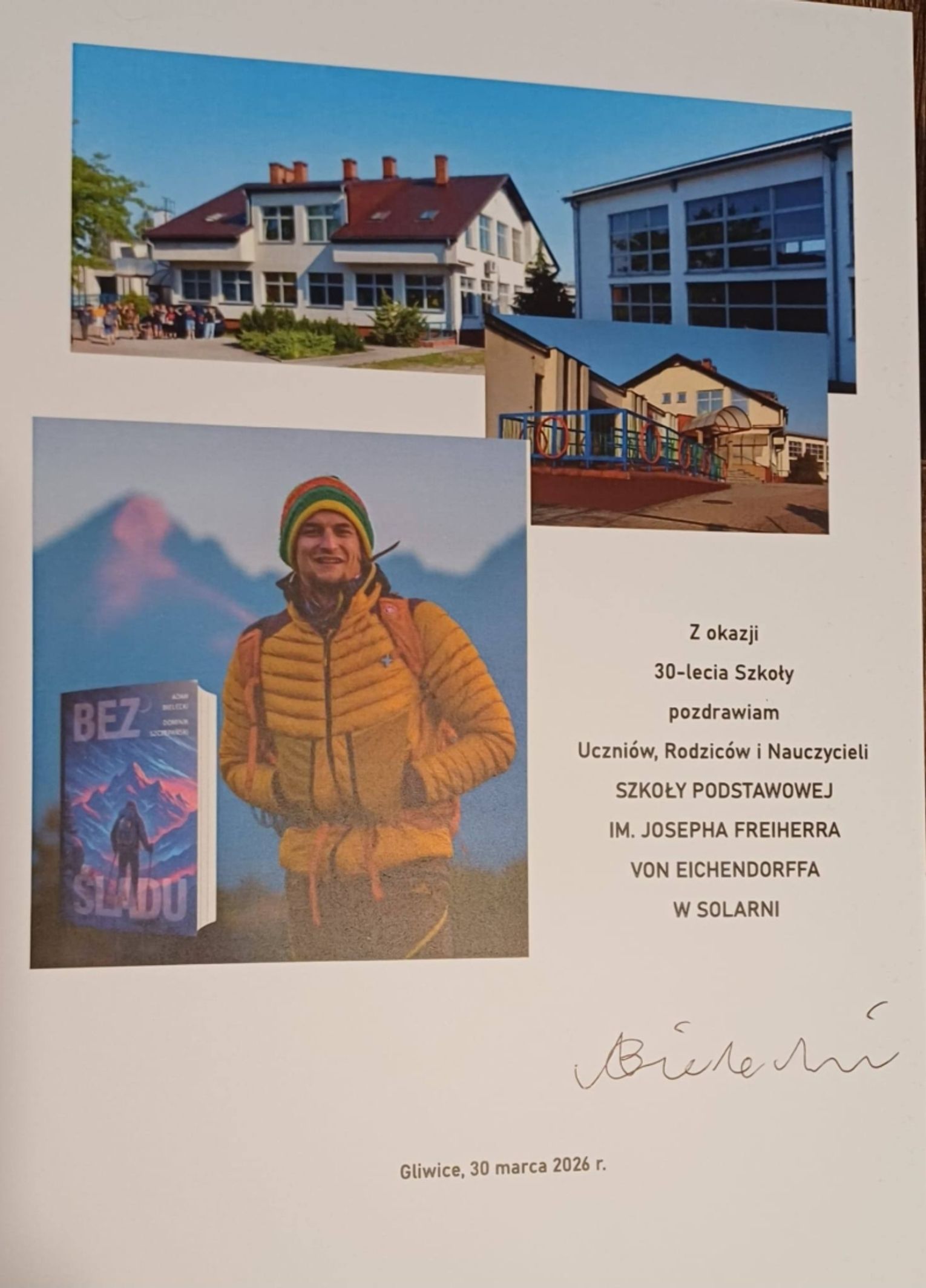 Wizyta miała także symboliczny wymiar. Z okazji 30-lecia szkoły w Solarni Adam Bielecki podpisał list gratulacyjny skierowany do uczniów, nauczycieli i rodziców. Dodatkowo, dzięki wsparciu Rady Rodziców, szkolna biblioteka wzbogaciła się o książkę „Bez śladu” z autografem autora.