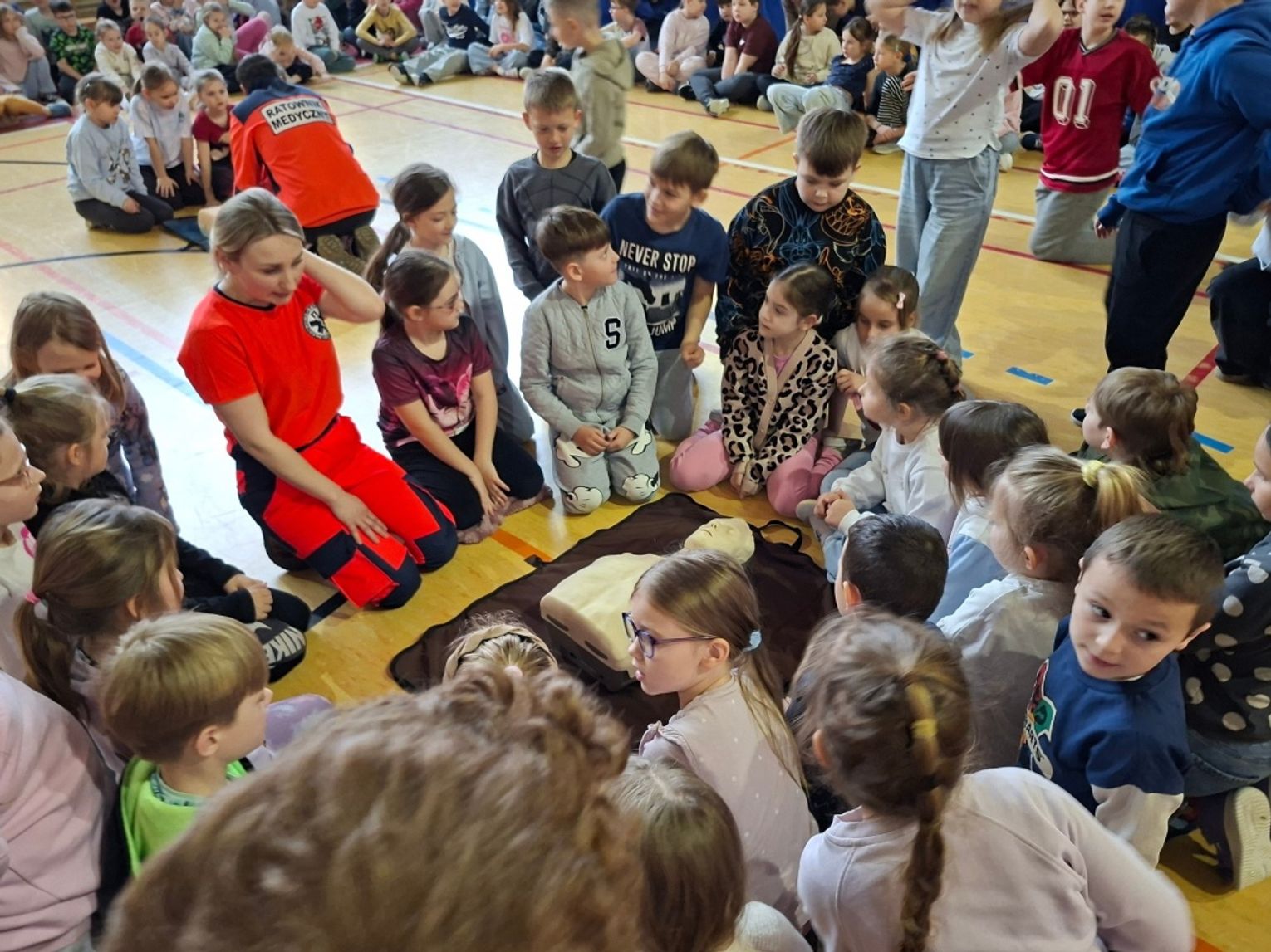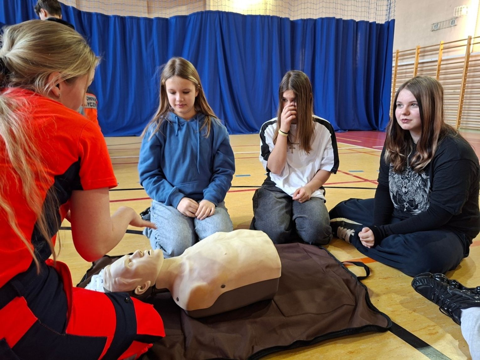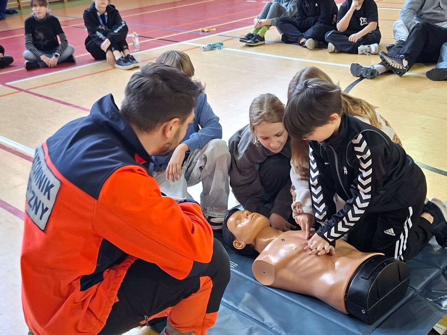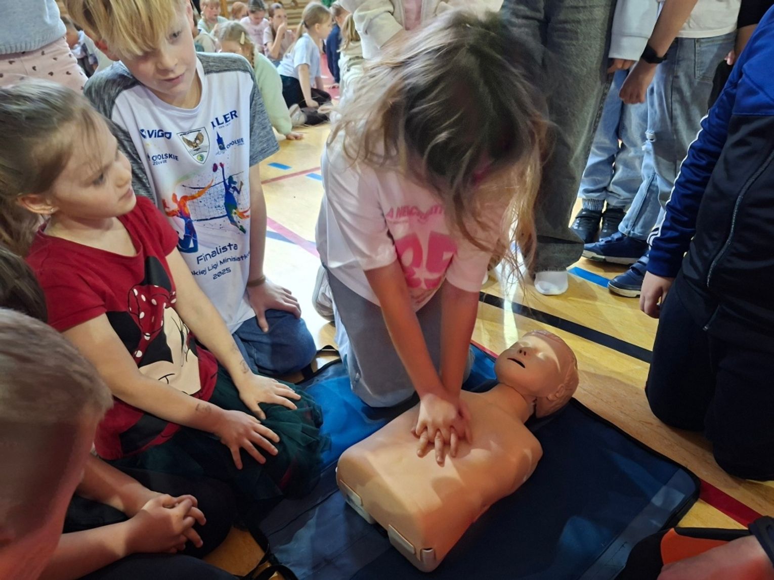 Sala gimnastyczna na kilka godzin zamieniła się w miejsce intensywnych ćwiczeń i symulacji. Dzieci i młodzież pracowali na fantomach, przechodząc przez różne scenariusze. W zajęciach uczestniczyły wszystkie klasy. Młodzi ludzie zdobyli nie tylko nowe umiejętności, ale też wiedzę, która może okazać się bezcenna. Przypomnieli sobie numery alarmowe oraz dowiedzieli się także, jak podczas udzielania pomocy zadbać o własne bezpieczeństwo.