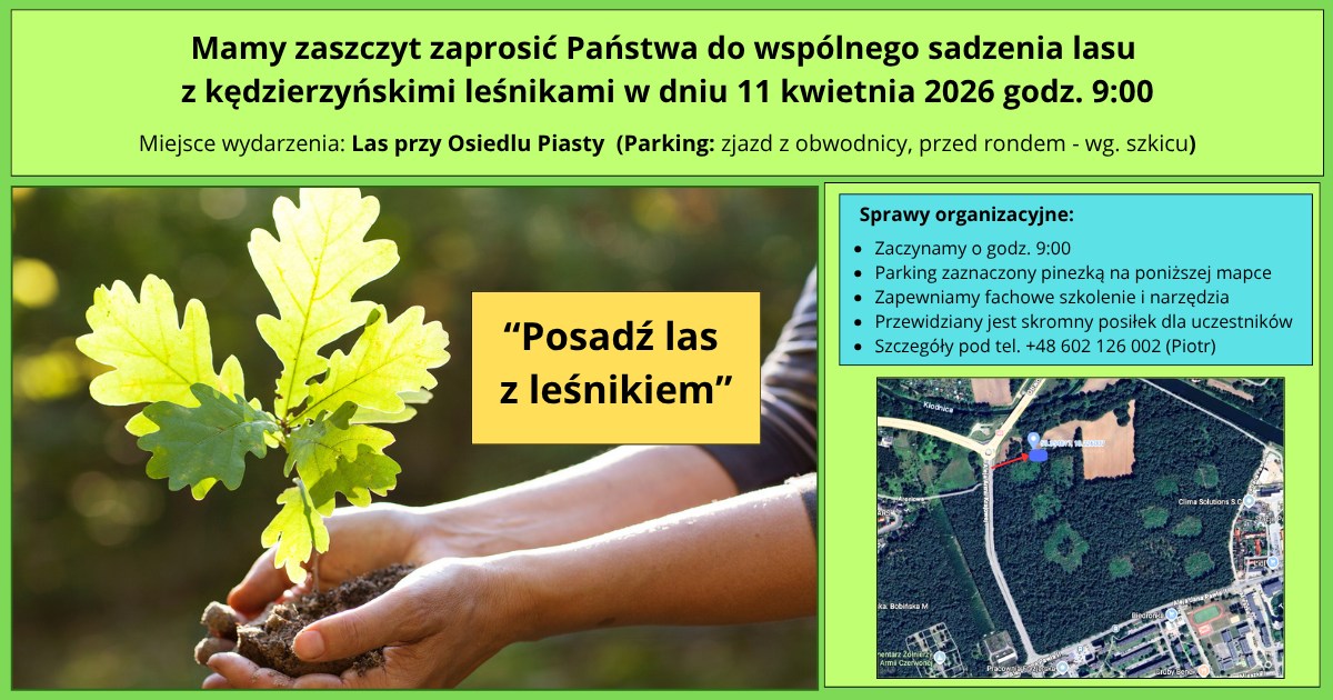 Akcja wspólnego sadzenia lasu z leśnikami odbędzie się w Nadleśnictwie Kędzierzyn, w Leśnictwie Brzeźce, w sąsiedztwie osiedla Piastów i ronda na obwodnicy (patrz mapka poniżej), a jej początek zaplanowano 11 kwietnia na godz. 9.00. To lokalna odsłona inicjatywy „Posadź las z leśnikiem”, w ramach której mieszkańcy regionu mogą aktywnie włączyć się w działania na rzecz przyrody i wspólnie z leśnikami stworzyć nowe pokolenie lasu.