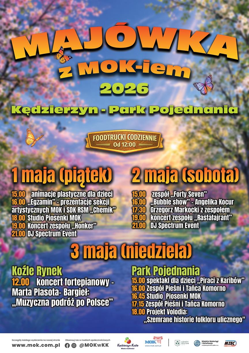 Majówka z Miejskim Ośrodkiem Kultury to propozycja dla tych, którzy chcą spędzić długi weekend aktywnie, radośnie i w otoczeniu dobrej kultury. Program wydarzenia został przygotowany tak, by połączyć pokolenia i stworzyć przestrzeń zarówno do wspólnej zabawy, jak i spokojnego uczestnictwa w koncertach oraz występach artystycznych. Główną areną wydarzeń będzie park Pojednania, a część niedzielnego programu odbędzie się również na kozielskim rynku. Przez wszystkie trzy dni na uczestników czekać będą także foodtrucki, dostępne codziennie od godziny 12.00.