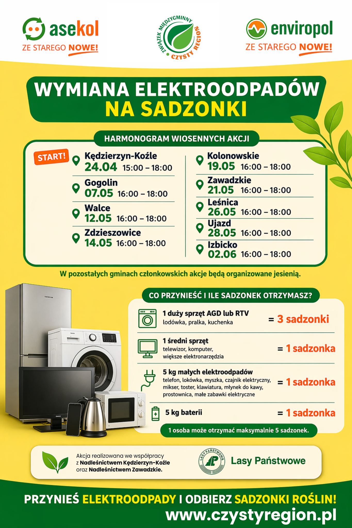 „Czysty Region” wspólnie z Enviropol PL , Asekol PL oraz przy wsparciu Lasów Państwowych zaprasza mieszkańców na akcję, w której za elektroodpady można otrzymać sadzonki. Czekają na Was m.in. kwiaty, zioła, a także sadzonki drzew.