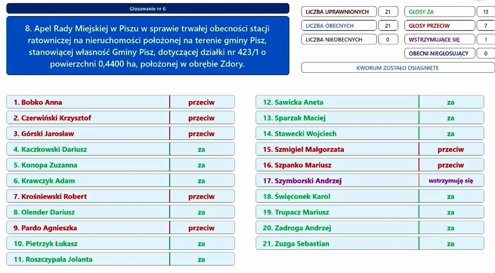 - Na sesji Rady Miasta Pisz, która obradowała 7 kwietnia 2026 roku, przyjęto uchwałę o wycofaniu działki ze sprzedaży oraz wystosowano apel Rady Miejskiej w Piszu do burmistrza Dariusza Kińskiego o udzielenie nam dzierżawy - informuje Kuba Gwiazdowski.