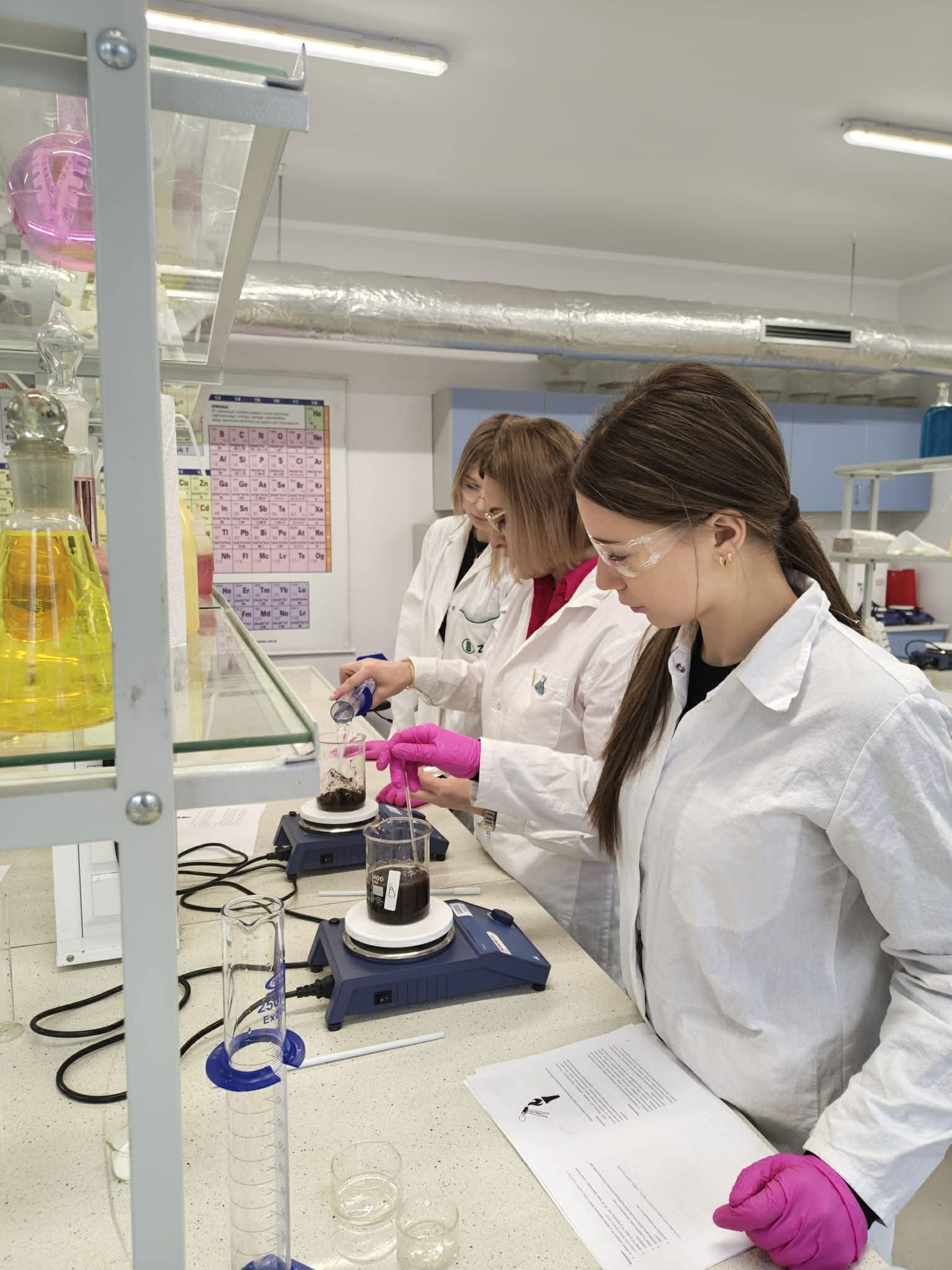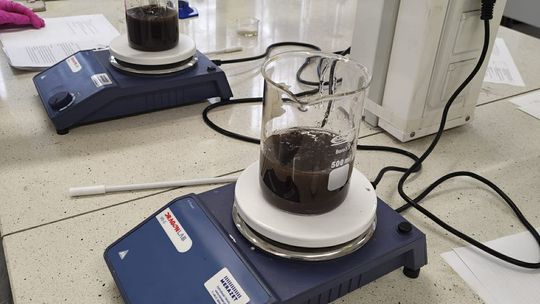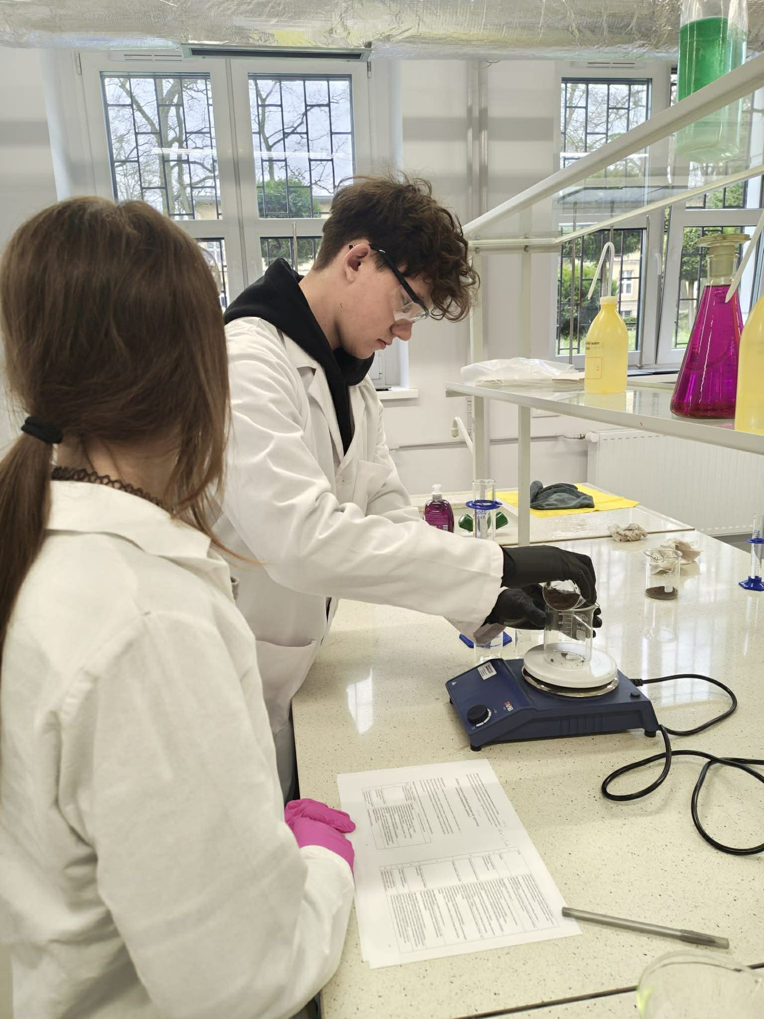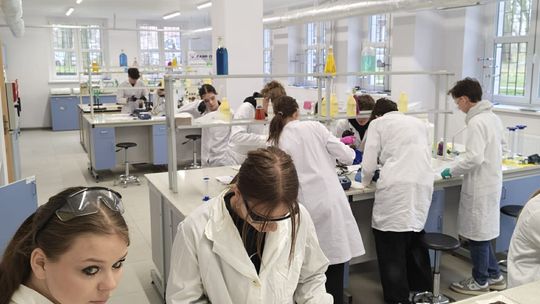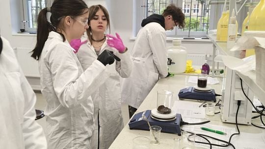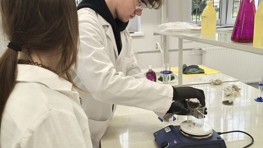 Następnie przystąpili do pracy laboratoryjnej. Podczas zajęć nie tylko wykonywali doświadczenia, ale także poznawali zasadę działania mieszadła mechanicznego.