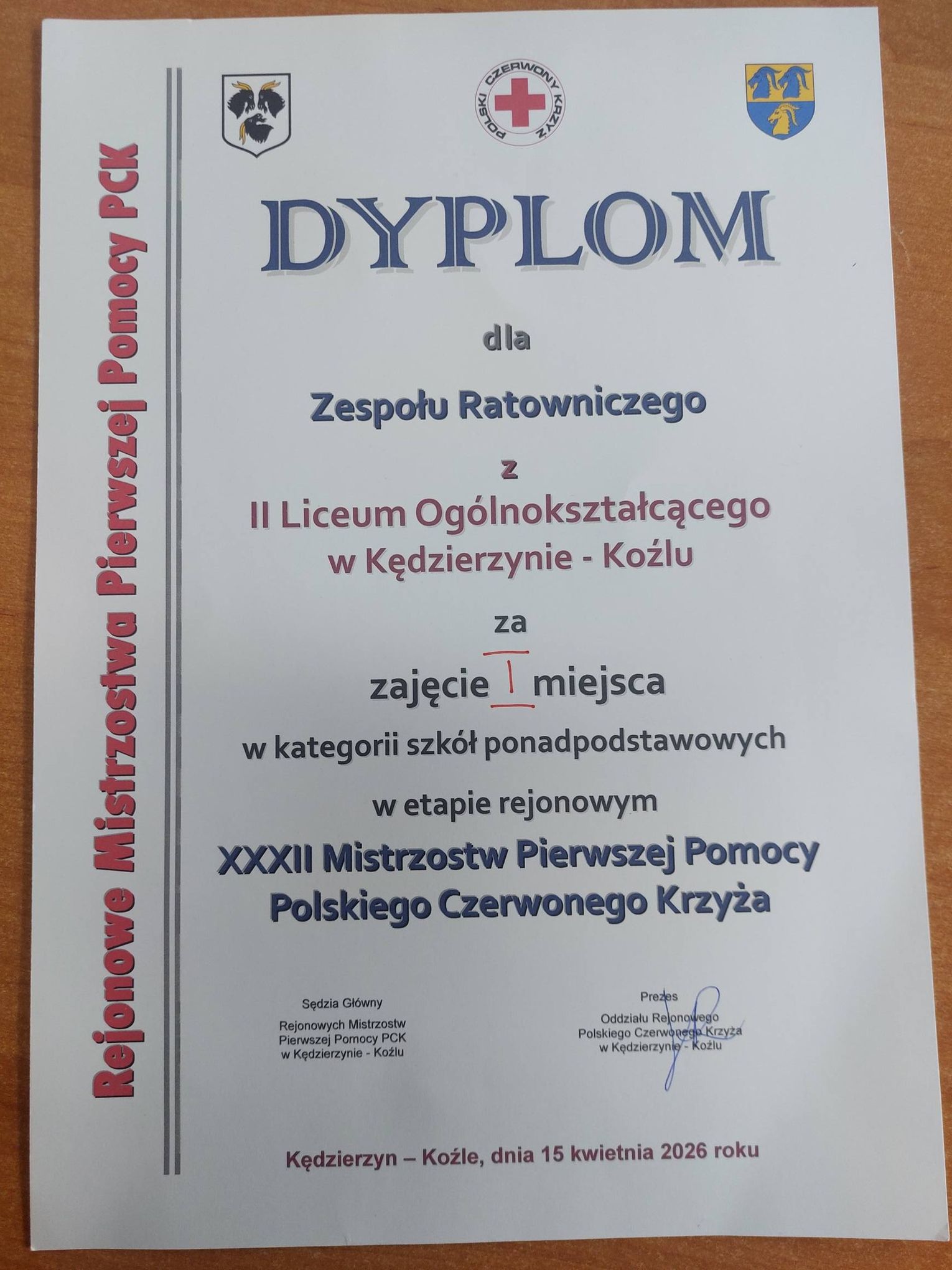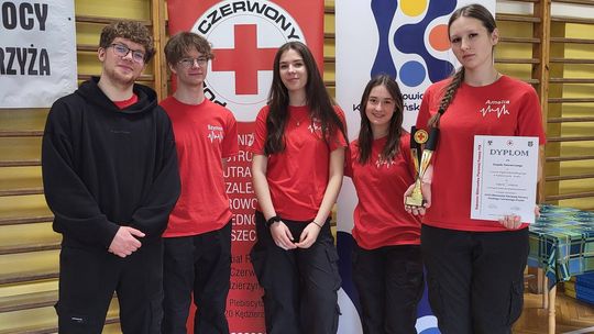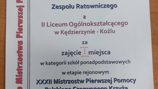 Miło nam poinformować, że nasza Szkolna Drużyna Pierwszej Pomocy w składzie: Amelia Kamińska 4b, Chiara Catovic 3b, Marta Wala 1c, Jakub Sadza 4b, Szymon Ziober 4a dzielnie walczyła i ostatecznie zajęła II miejsce. BRAWO DRUŻYNA!!! JESTEŚMY Z WAS BARDZO DUMNI!!! – czytamy na facebookowym profilu I LO im. Henryka Sienkiewicza w Kędzierzynie-Koźlu