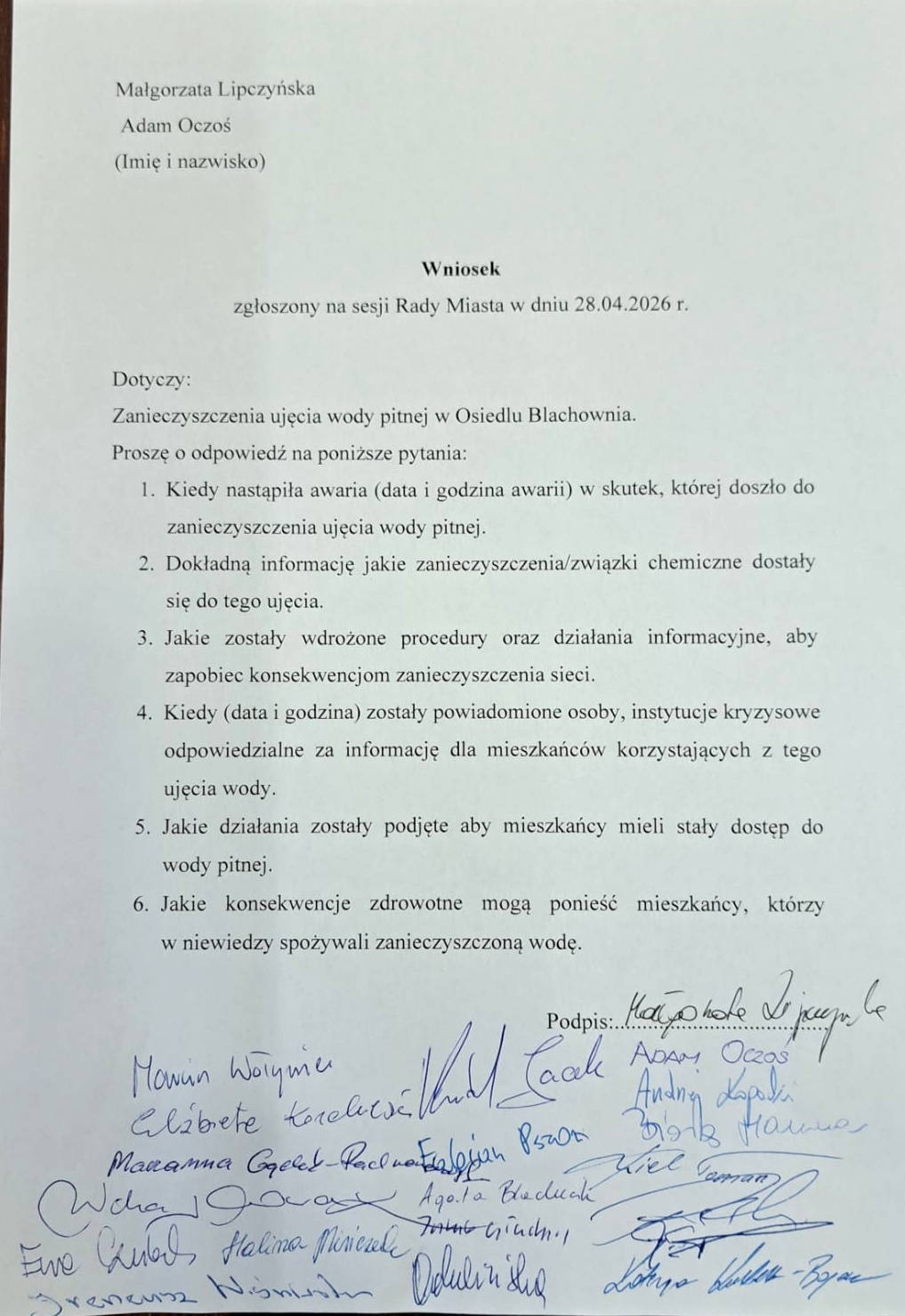 Poniżej filmik z wypowiedziami radnych miejskich Małgorzaty Lipczyńskiej i Adama Oczosia w sprawie zanieczyszczenia wody pitnej w Blachowni oraz wniosek podpisany przez wszystkich rajców, w którym domagają się odpowiedzi na szereg kluczowych pytań w tym temacie.
