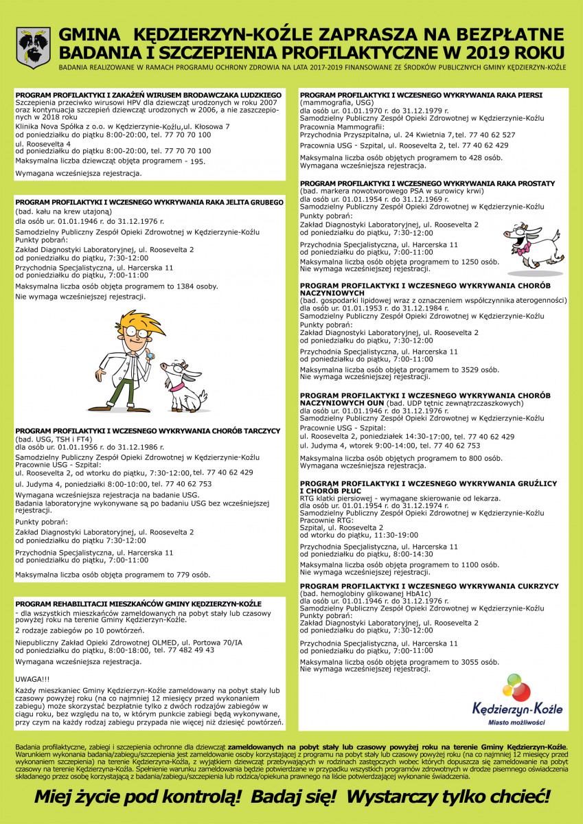 Nasze miasto kolejny rok z rzędu umożliwia przeprowadzenie bezpłatnej kontroli stanu zdrowia. Mieszkańcy całkowicie za darmo mogą skorzystać aż z kilkunastu programów profilaktycznych finansowanych przez gminę. Warunkiem jest posiadanie zameldowania na pobyt stały lub czasowy powyżej 12 miesięcy przed wykonaniem badania. Co ważne, badania laboratoryjne, pobranie wymazu, USG czy RTG są zwykle bezbolesne i nie zajmują wiele czasu. Część badań nie wymaga nawet rejestracji. W ten sposób można dokonać dokładnego przeglądu swojego ciała pod kątem wielu chorób, m.in.: cukrzycy, różnego rodzaju nowotworów (raka piersi, raka prostaty, raka jelita grubego, raka płuc), chorób naczyniowych, a nawet gruźlicy. W programie znajdują się także szczepienia przeciwko wirusowi HPV. Prowadzone są również zabiegi rehabilitacyjne, w tym masaże.