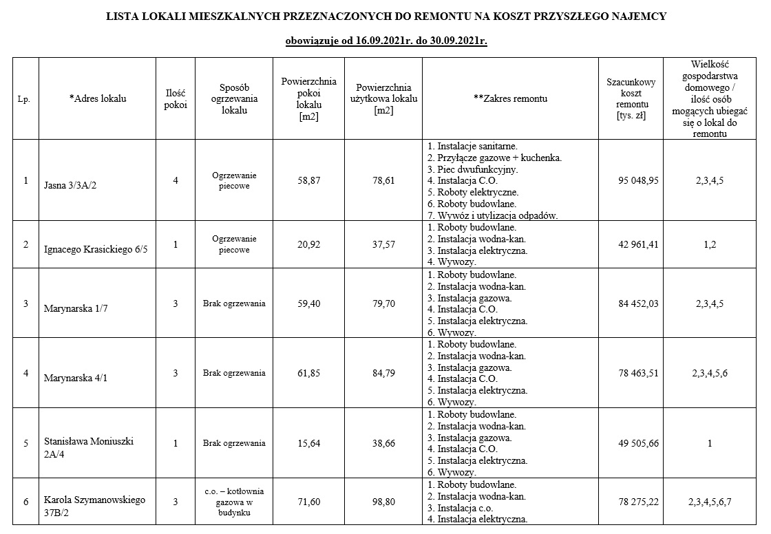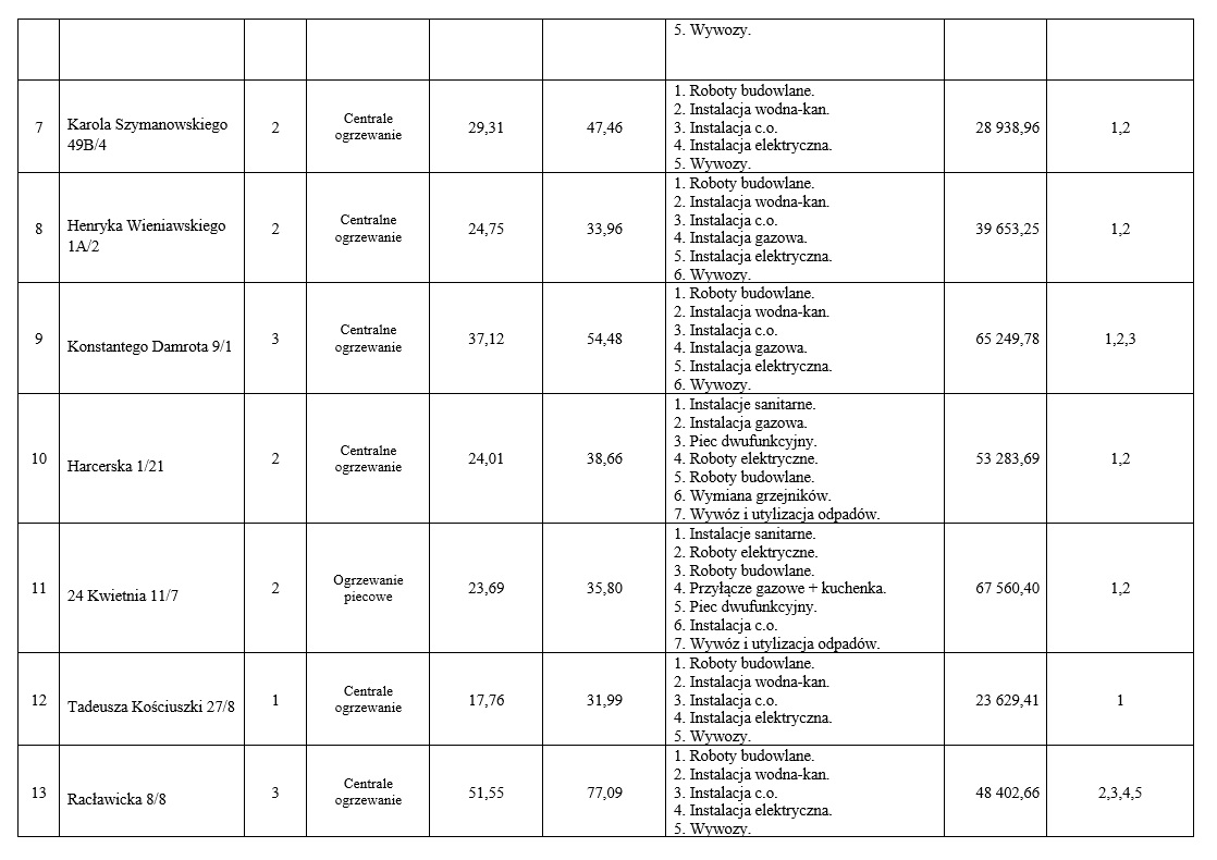Powierzchnia pokoi w mieszkaniach przeznaczonych do remontu dla pojedynczych osób waha się od 15 do 70 m2. W przypadku gospodarstw wieloosobowych obowiązuje przelicznik minimum 10 m2 na osobę. Opublikowana lista adresów zawiera również zakres niezbędnych do przeprowadzenia prac oraz ich szacunkowy koszt. Zainteresowani mieszkańcy mogą oglądać wybrane przez siebie lokale w dniach: