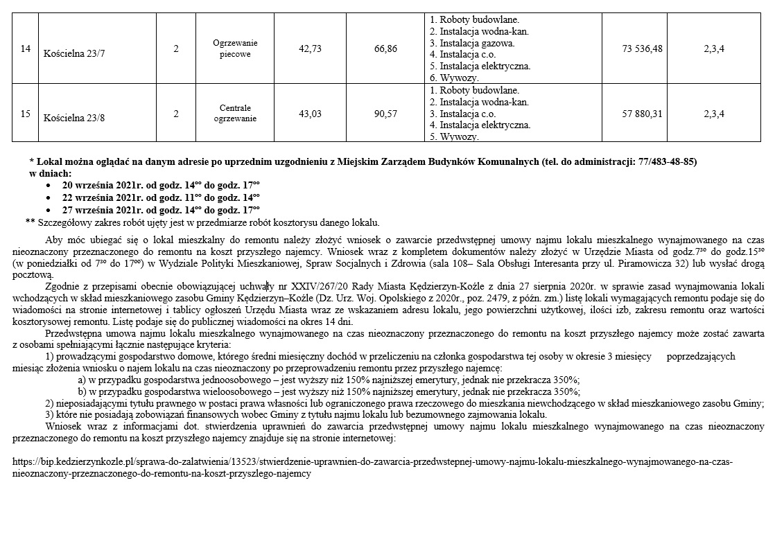 Poniżej w załącznikach publikujemy listę lokali przeznaczonych do remontu na koszt przyszłego najemcy, treść uchwały określającą zasady ubiegania się o mieszkania oraz wzory wniosków. Wszelkich szczegółów udzielają pracownicy Wydziału Polityki Mieszkaniowej, Spraw Socjalnych i Zdrowia, tel. 77 405 03 26, 77 405 03 10. Opis samej procedury można również znaleźć w Biuletynie Informacji Publicznej: https://bip.kedzierzynkozle.pl/sprawa-do-zalatwienia/13523/stwierdzenie-uprawnien-do-zawarcia-przedwstepnej-umowy-najmu-lokalu-mieszkalnego-wynajmowanego-na-czas-nieoznaczony-przeznaczonego-do-remontu-na-koszt-przyszlego-najemcy.