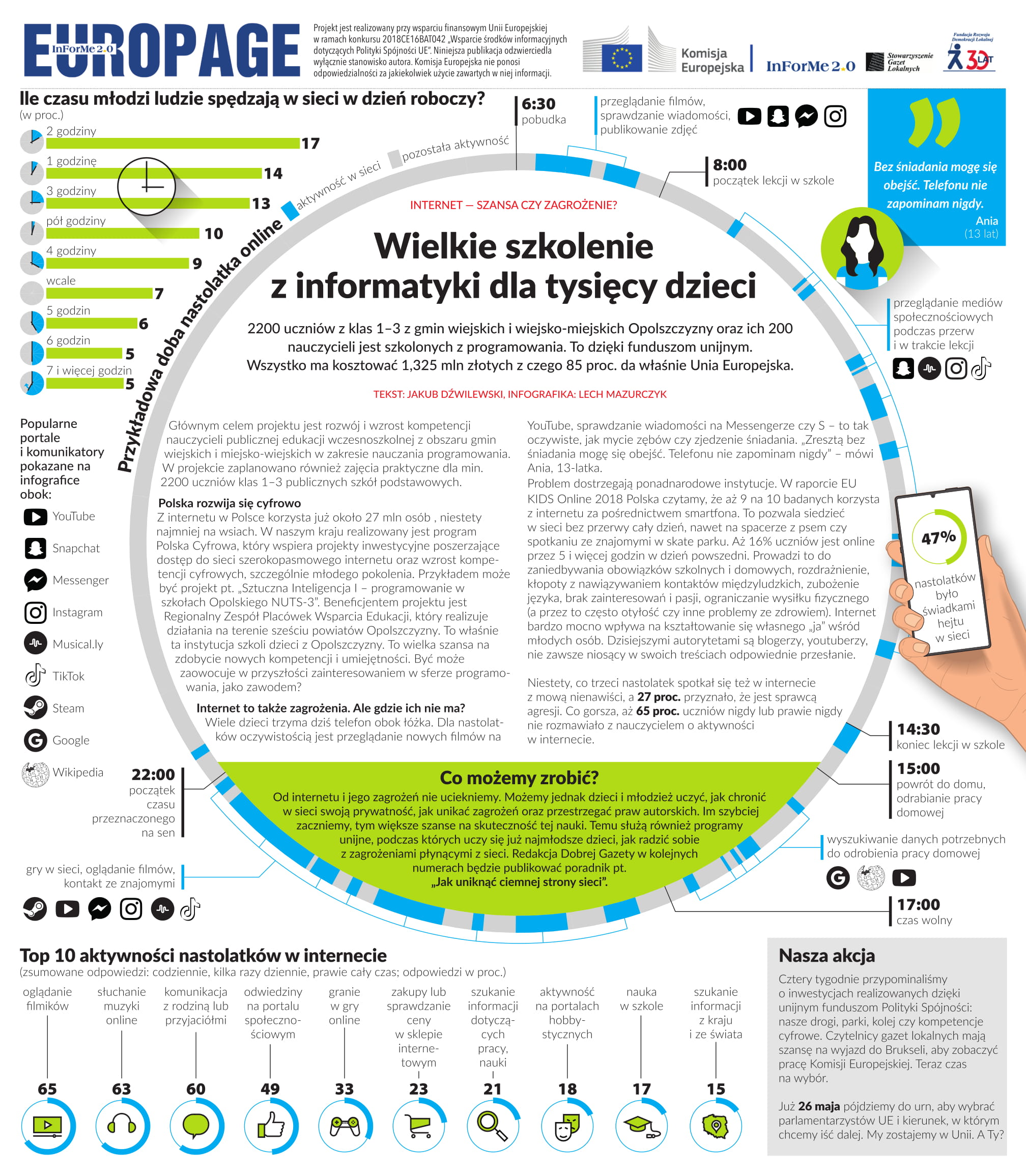 W sześciu powiatach Opolszczyzny 2200 uczniów z klas 1-3 bierze udział w praktycznych zajęciach z programowania, realizowanych w ramach projektu Polska Cyfrowa, poszerzającego dostęp do Internetu i kompetencje cyfrowe młodego pokolenia. Czy to nie za wcześnie? Nie, jeśli zdamy sobie sprawę, że już kilkulatki mają smartfony, a 27 proc. polskich nastolatków przyznaje, że jest sprawcą agresji w Internecie (badanie z 2018r.). Dla pokolenia „urodzonego w sieci”, czyli naszych dzieci i wnuków, Internet to zarazem szansa i zagrożenie, ale dzięki takim zajęciom, jak na Opolszczyźnie, może stać się przede wszystkim szansą.
