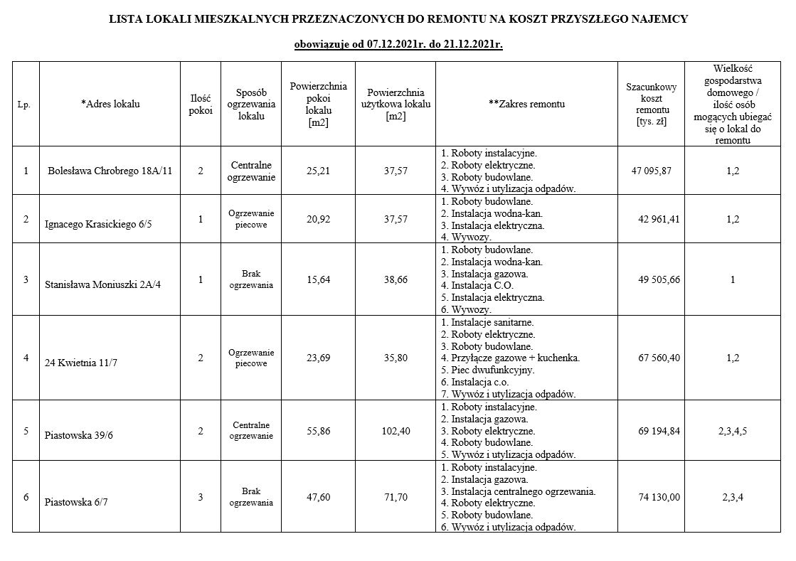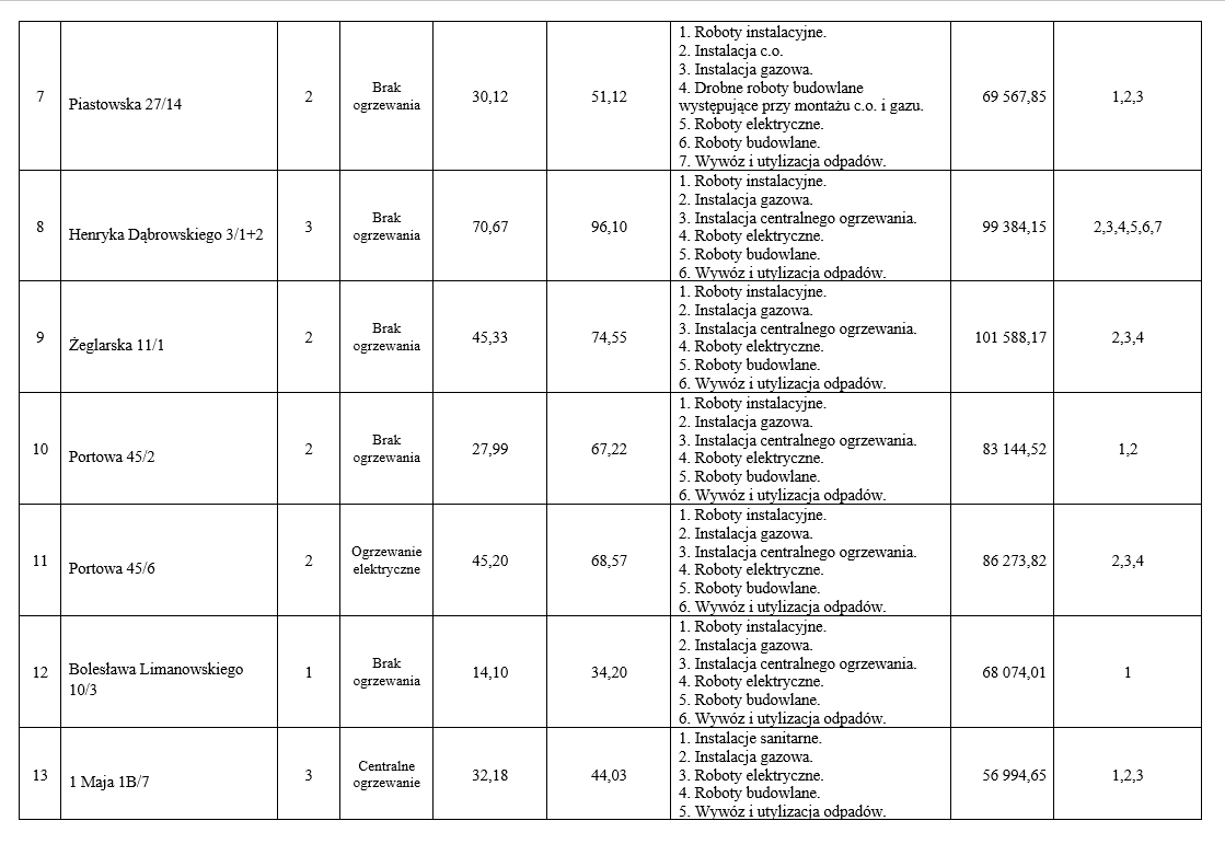 Powierzchnia pokoi w mieszkaniach przeznaczonych do remontu dla pojedynczych osób waha się od 15 do 70 m2. W przypadku gospodarstw wieloosobowych obowiązuje przelicznik minimum 10 m2 na osobę. Opublikowana lista adresów zawiera również zakres niezbędnych do przeprowadzenia prac oraz ich szacunkowy koszt. Zainteresowani mieszkańcy mogą oglądać wybrane przez siebie lokale w dniach:
