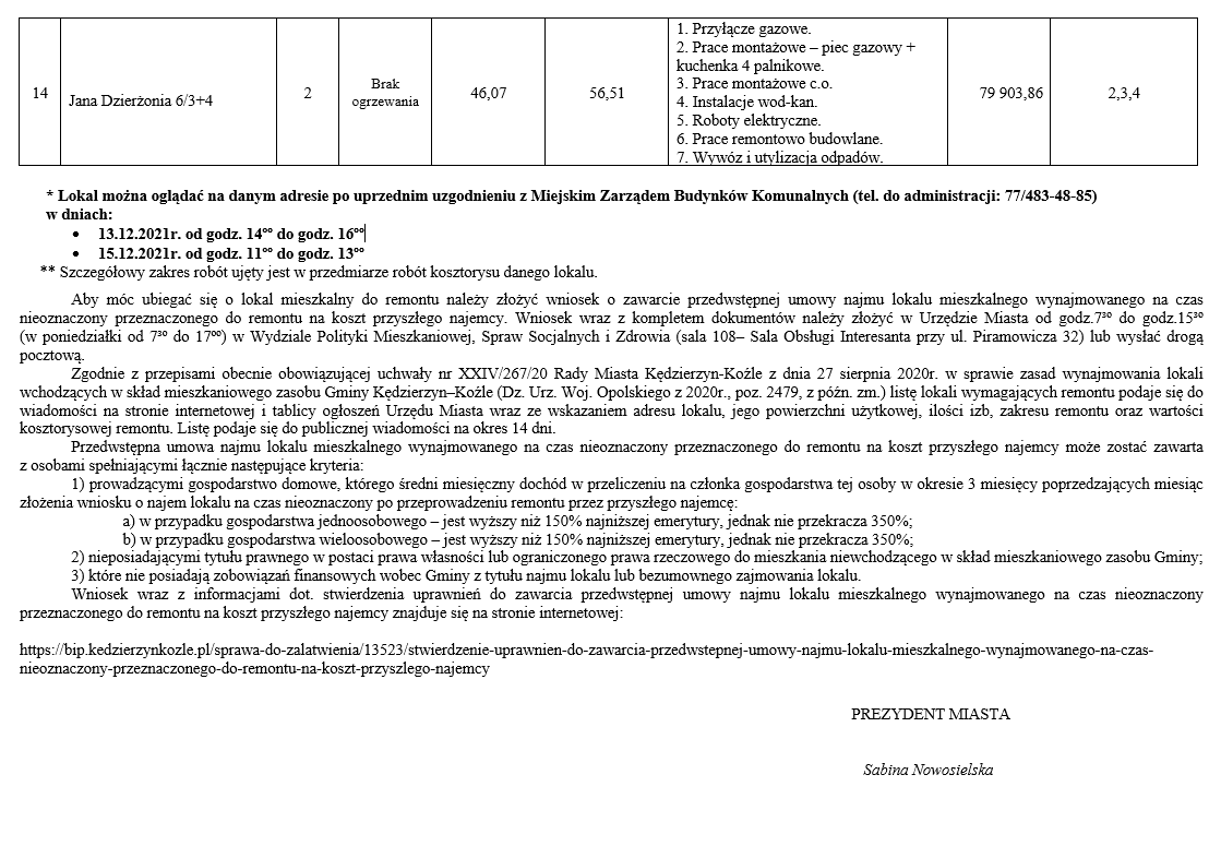 Poniżej w załącznikach publikujemy listę lokali przeznaczonych do remontu na koszt przyszłego najemcy, treść uchwały określającą zasady ubiegania się o mieszkania oraz wzory wniosków. Wszelkich szczegółów udzielają pracownicy Wydziału Polityki Mieszkaniowej, Spraw Socjalnych i Zdrowia, tel. 77 405 03 26, 77 405 03 10. Opis samej procedury można również znaleźć w Biuletynie Informacji Publicznej: https://bip.kedzierzynkozle.pl/sprawa-do-zalatwienia/13523/stwierdzenie-uprawnien-do-zawarcia-przedwstepnej-umowy-najmu-lokalu-mieszkalnego-wynajmowanego-na-czas-nieoznaczony-przeznaczonego-do-remontu-na-koszt-przyszlego-najemcy.